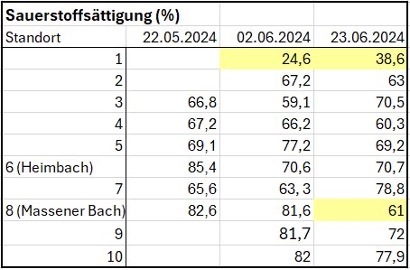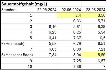 In den Tabellen 2 und 3 sind der Sauerstoffgehalt in mg/L sowie die Sauerstoffsättigung in % erkennbar. Standort 1, also Nahe der Quelle der Körne, weist auffällig niedrige Sauerstoffwerte an. Im Verlauf des Gewässers ist zu sehen, dass insbesondere die Sauerstoffsättigung tendenziell in Fließrichtung ansteigt. Am dritten Probetag lag außerdem der Sauerstoffgehalt sowie die -sättigung des Massener Baches in einem deutlich geringeren Bereich als an den anderen beiden Probetagen mit einem Rückgang von 20 % Sauerstoffsättigung im Vergleich zu davor.