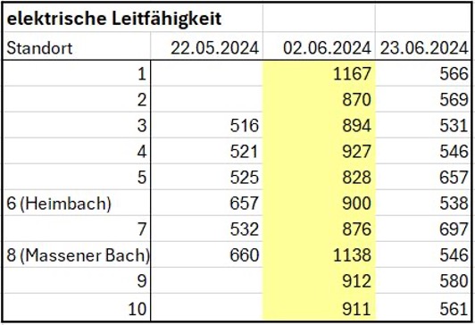 In den Tagen vor und auch am zweiten Probetag selbst war zunächst wenig bis schließlich zwei Tage davor und einschließlich des 02.06. kein Niederschlag festzustellen. Dies kann die elektrische Leitfähigkeit und die etwas niedrigeren Temperaturen erklären (vgl. Tabellen 1 und 4 des Abschnittes “Die Körne – Die Wasserparameter an den Probetagen”). Die Temperaturen am zweiten Probetag betragen 12,4 bis 16 °C.