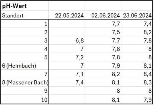 Am Körnebach waren keine besonderen Auffälligkeiten am pH-Wert ersichtlich (vgl. Tabelle 5). Am ersten und zweiten Probetag ist tendenziell erneut ein Anstieg des Wertes in Fließrichtung des Gewässers zu erkennen, der jedoch eher schwach ist. Grundsätzlich befindet sich die Körne mit einem pH-Wert von etwa 7-8 im eher neutralen und für die Organismen ungefährlichen Bereich.