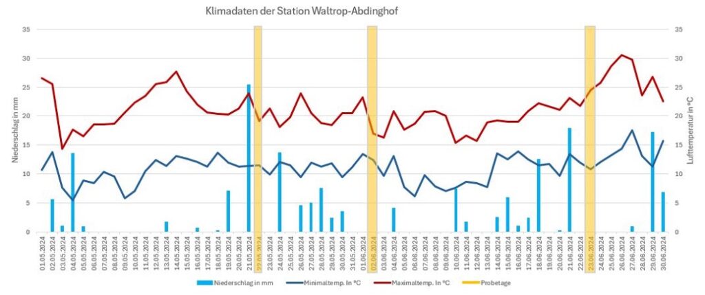 Im beschriebenen Zeitraum schwankt die Minimaltemperatur insgesamt von 5,4 °C bis 17,5 °C und die Maximaltemperatur von 14,3 °C bis 30,5 °C. Die Niederschläge lagen in einem Bereich zwischen 0 mm und 25,5 mm. In der Abbildung sind die drei Probetage hervorgehoben, um auf die Bedingungen bei der Probenahme eingehen zu können.