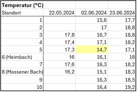 Im Rahmen der Messungen am Körnebach schwanken die Wassertemperaturen an den Probetagen im Mai und Juni 2024 insgesamt zwischen 14,7 °C und 19,2 °C, wobei sich jedoch die meisten Wasserproben im Bereich von etwa 16 bis 18 °C befinden (vgl. Tabelle 1). Auffällig ist eine starke Schwankung der Wassertemperatur an Probestandort 5 am 2. Juni im Vergleich zu den vorherigen und nachfolgenden Standorten. Die Lufttemperaturen sind am 2. Juni ebenfalls kälter als an den anderen beiden Probetagen, was eine Erklärung hierfür darstellen kann.