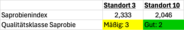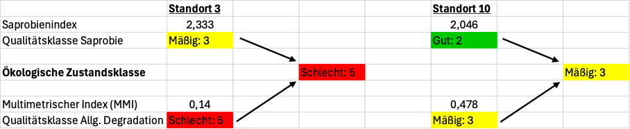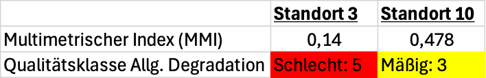 Es ist zu erkennen, dass der Standort 3 einen multimetrischen Index von 0,14 hat. Damit lässt sich der Standort 3 in die Qualitätsklasse 5 (schlecht) einordnen. Bei Standort 10 lassen sich hingegen etwas bessere Werte erkennen. Der multimetrische Index liegt bei 0,478 und somit lässt sich das Gewässer an diesem Standort in die Qualitätsklasse 3 (mäßig) einordnen.