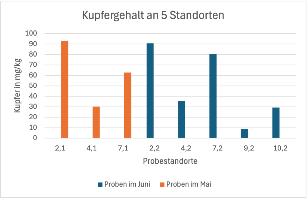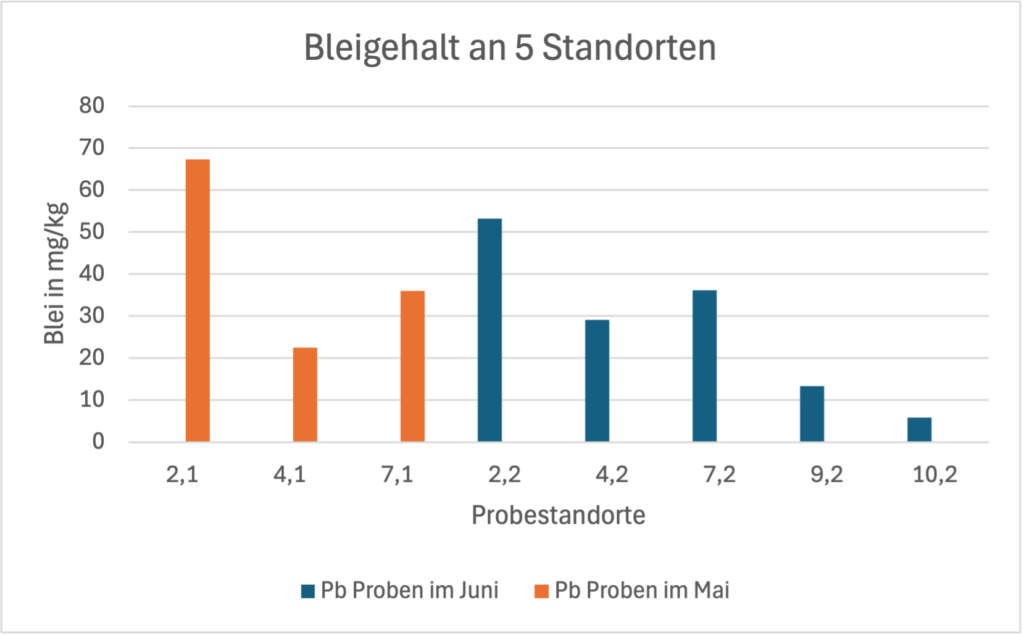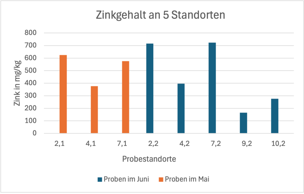 Bei genauerer Betrachtung der Schwermetallgehalte an Probestandort 2 (vgl. Abb. 1), lässt sich eine Differenz zwischen den Messungen am 22. Mai und am 02. Juni feststellen. Die Werte nach dem Starkregenereignis sind bei fast allen Schwermetallen höher als die Werte von den Messungen im Juni, was auf eine erhöhte Auswaschung von Schwermetallen hinweist.