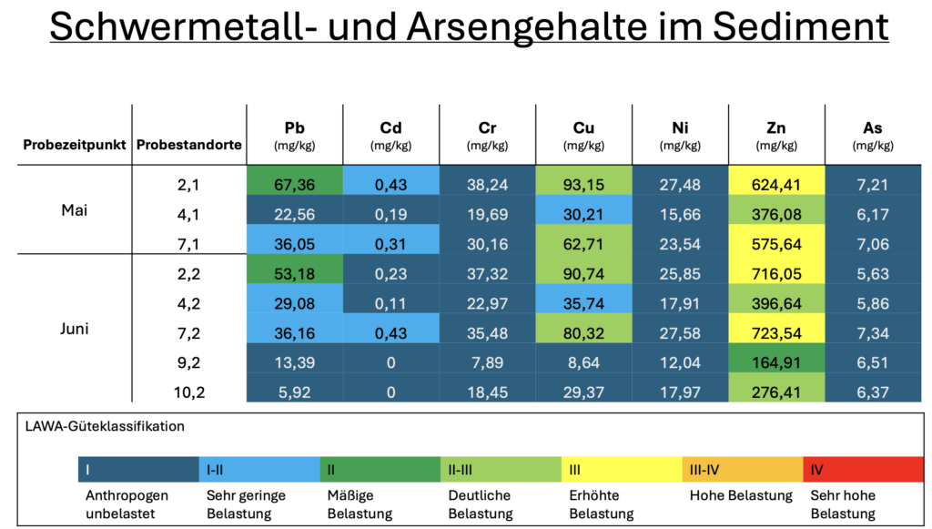 Abb. 1: Schwermetall- und Arsengehalte im Sediment des Körnebachs 2024 nach LAWA-Güteklassifikation